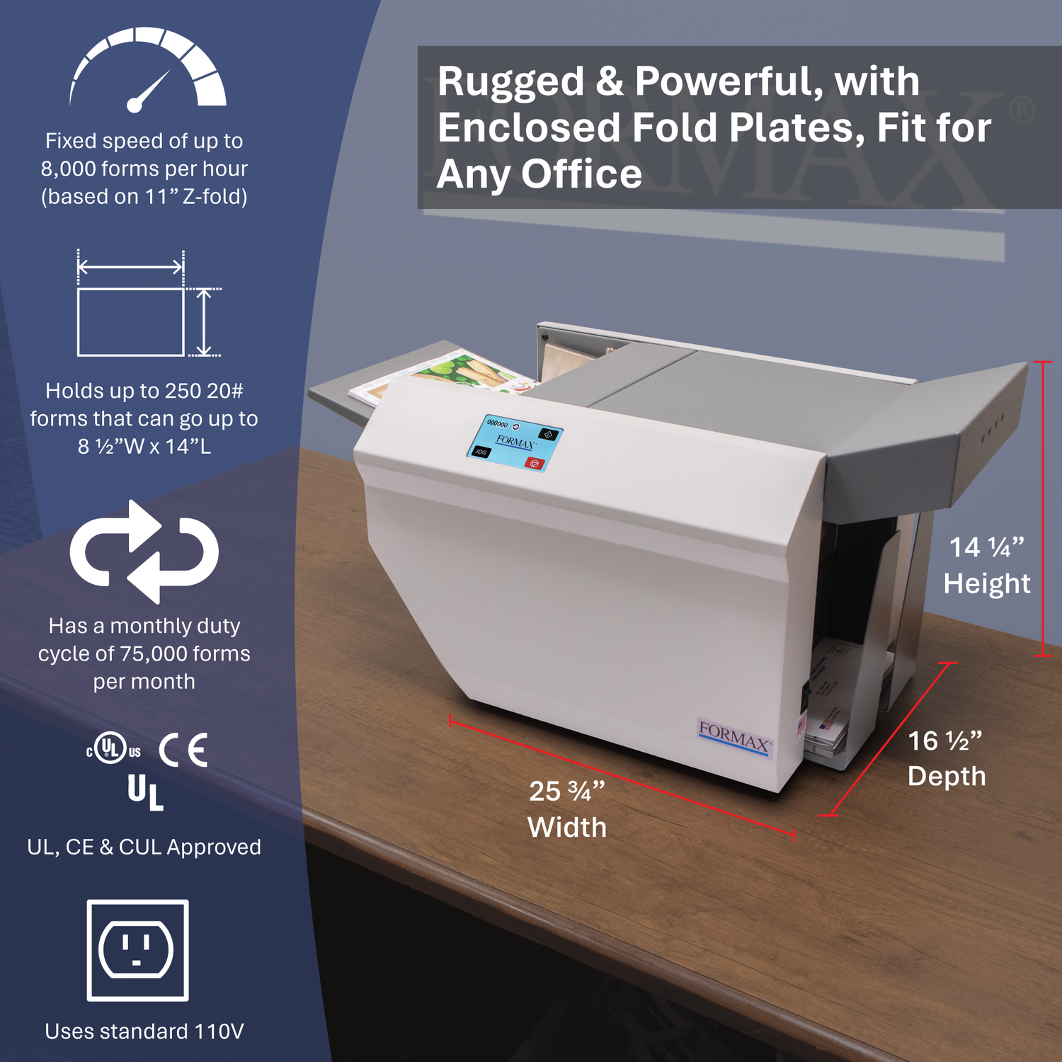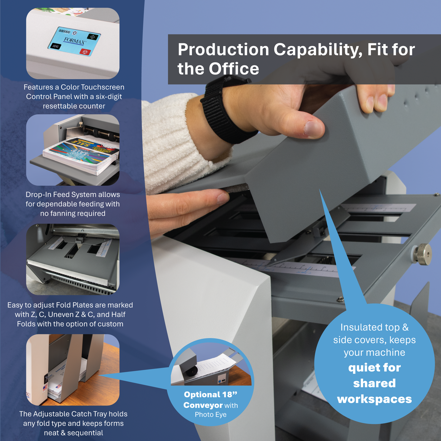 Designed and manufactured in the USA, the Formax FD 2006 also features a six-digit counter for complete processing audit, fault detector, LED indicators for error alerts, and jog control for aligning forms. The top and side covers contribute to noise reduction, maintaining a conducive workplace environment.