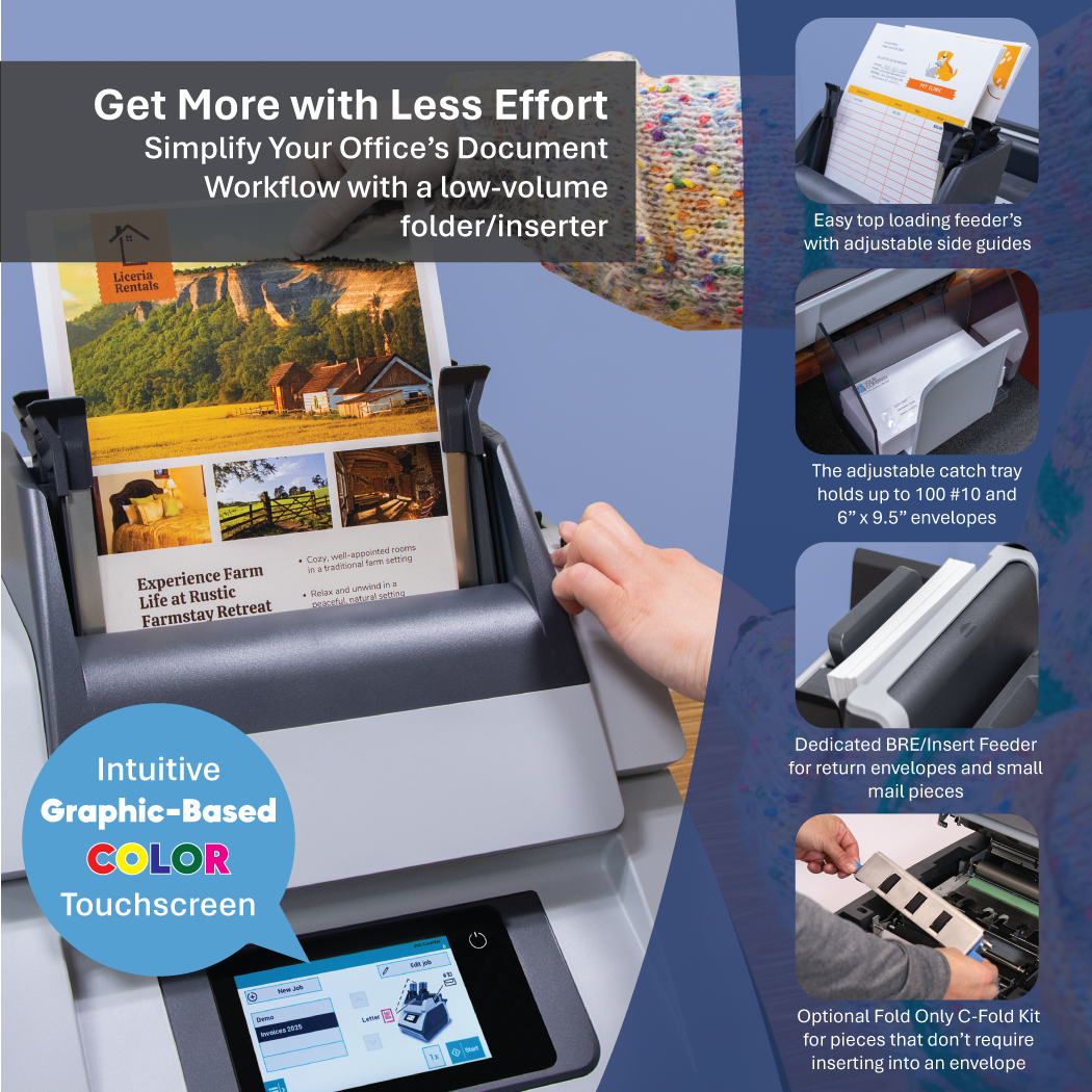 - Supporting fold types of C, V, Double Parallel, and no fold, this inserter maximizes flexibility in document processing.
