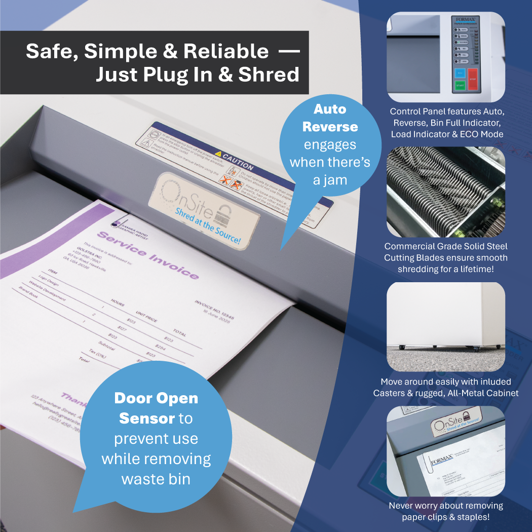The Formax OnSite FD 8402CC is a high-performance cross-cut shredder designed for secure and efficient office use. It combines durability, speed, and data protection in a compact form.