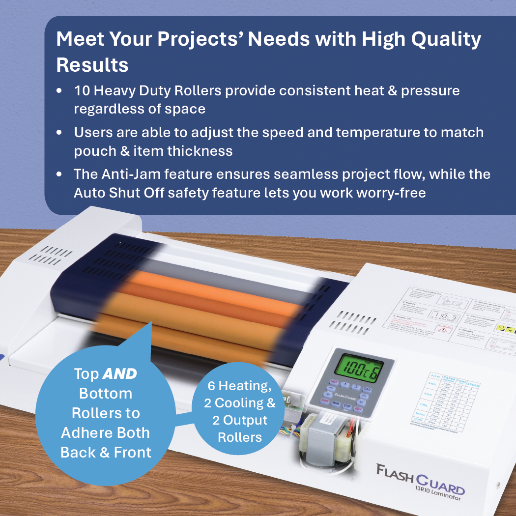 The Formax FlashGuard 13R10 is a professional pouch laminator built for high-volume environments that demand speed and precision. Its metal construction and 10-roller system deliver consistent, high-quality results across a wide range of materials.